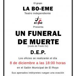 Micro teatro El grupo la BO-EME teatro independiente.presenta: UN FUNERAL DE MUERTE (Viudo de Frank Oz) 8 de diciembre a las 18:00 h. Salón municipal de El Royo. Galería de Imágenes Comparte esta Página